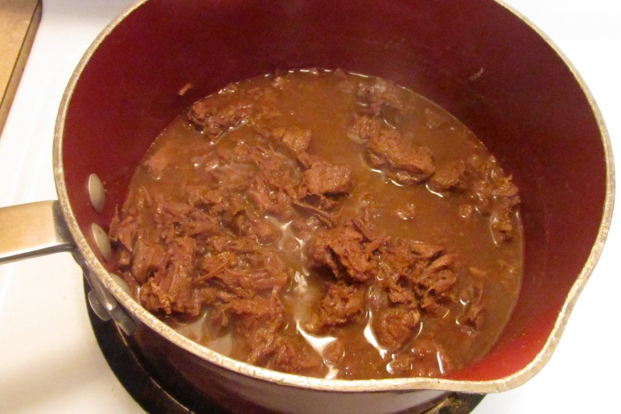 After about 3 minutes of cooking the meat begins to fall apart.