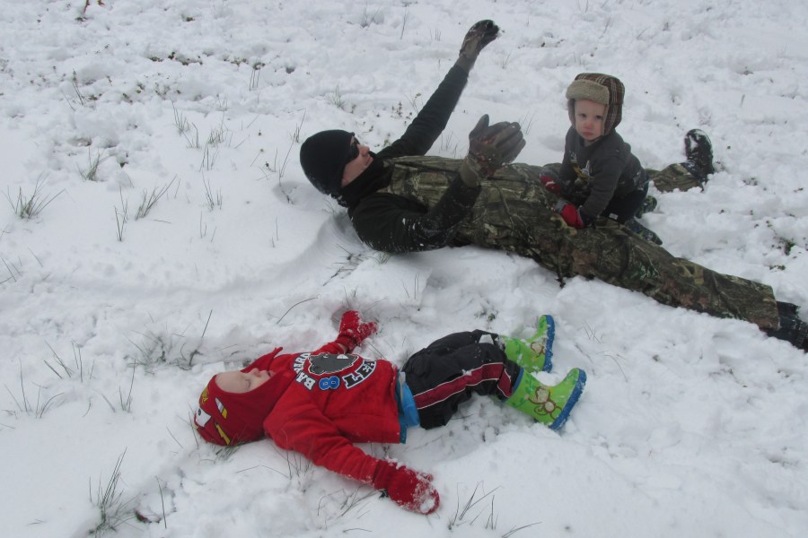Making snow angels! Nathanael’s shirt rode up and his back got cold & wet. Brr. 😦